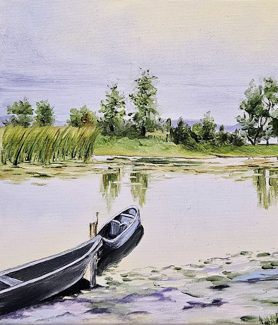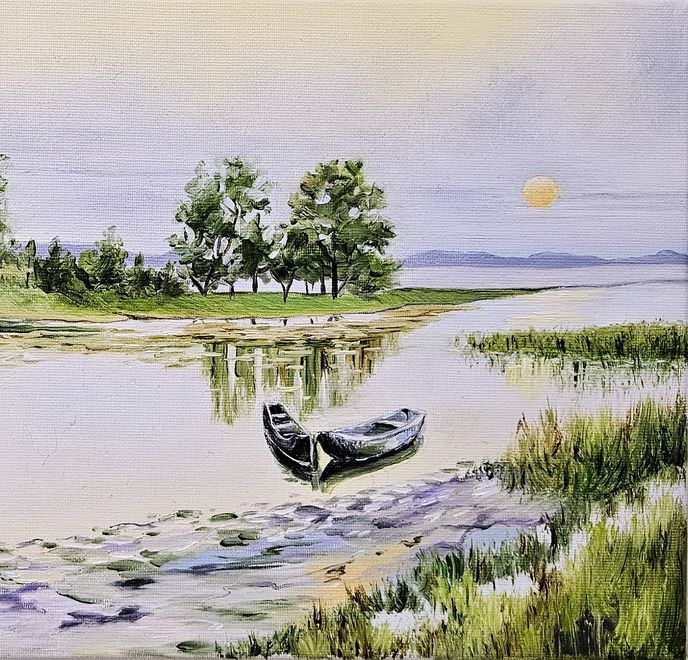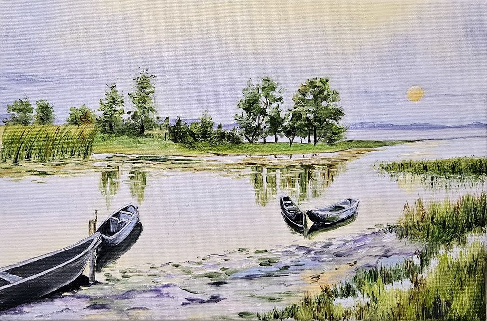 Картина з човнами, картина з річкою, вечірний пейзаж, маленька картина, картина для душевного спокою.