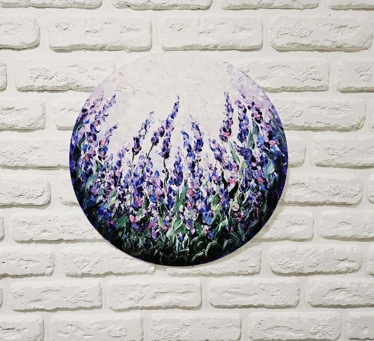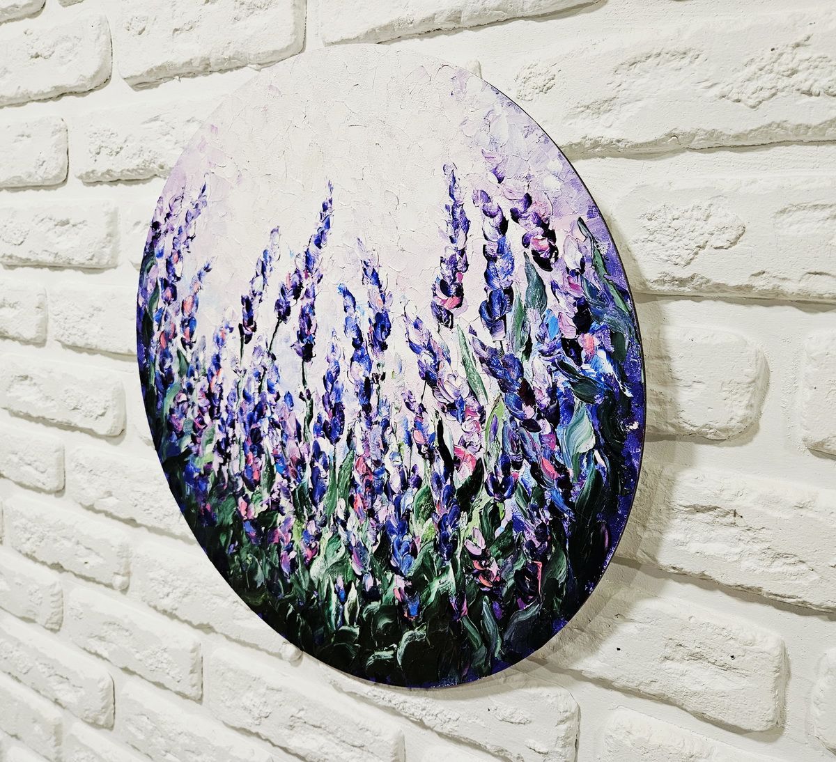 Кругла картина з декоративним невеликим мольбертом у комплекті, має кріплення для вішання безпосередньо на стіну.